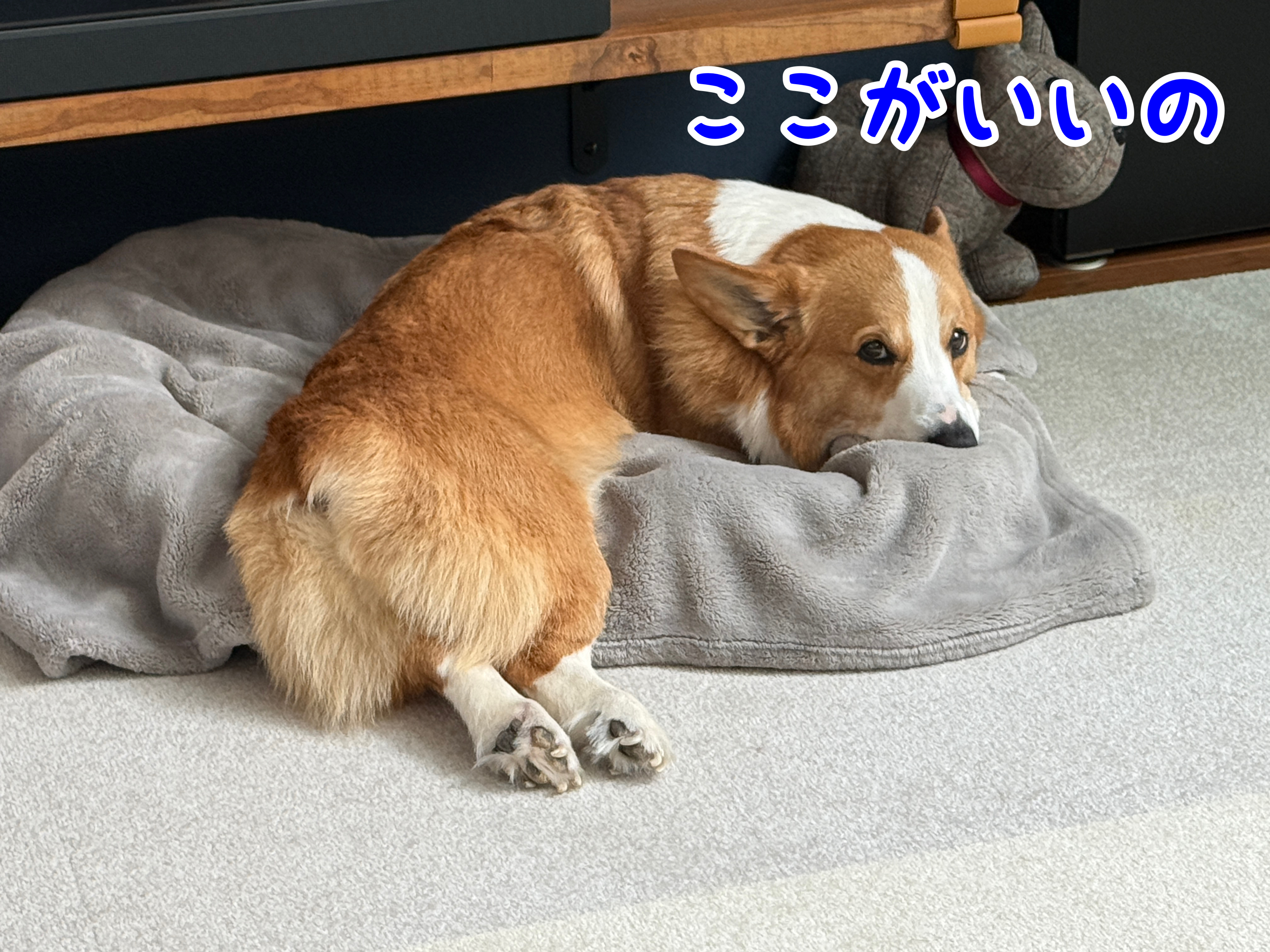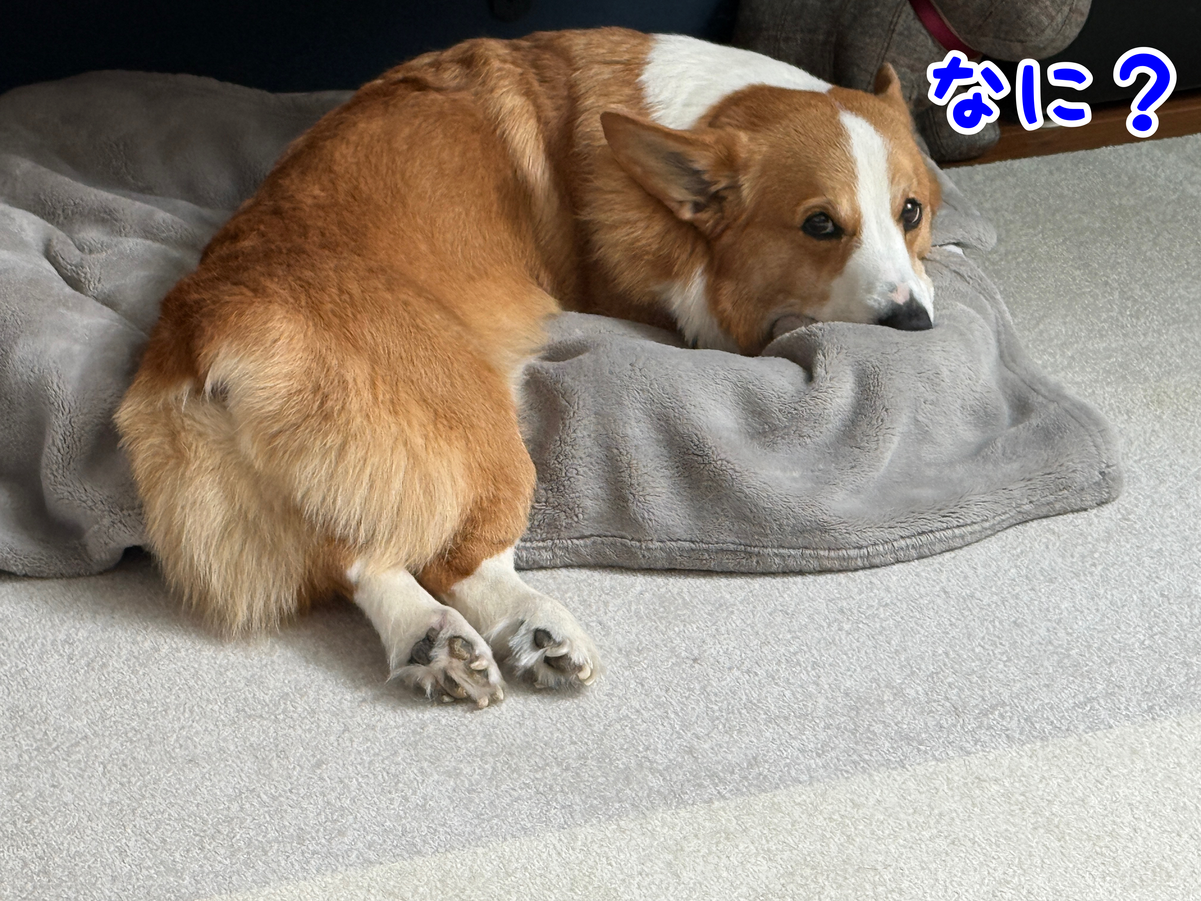 ベッドからおちりがはみ出ちゃってるはるさん🐶